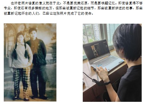 活动结束的那天,那位爷爷握住志愿者的手:“谢谢你们,把我和她的青春,从樟木箱底请了出来。”志愿者在日志中写道:“原来代码里藏着温度,像素中盛满深情。“筑梦”青年志愿者服务队已计划将老照片修复纳入常态化服务,让青春的代码持续为时光存档,让科技的温度永远为记忆赋能。