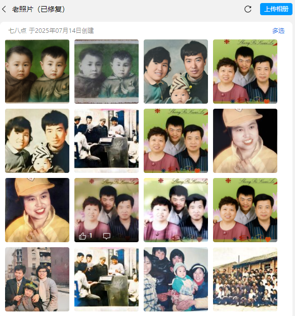 像这样的修复故事在社区不断上演。无数段时光碎片,在青年志愿者的键盘声中重新拼凑完整:有1975年知青下乡时的集体照,褪色的军绿色在算法校正下重现鲜亮;有1982年的全家福,孩子们脸上的墨渍被AI技术温柔抹去;还有1953年的黑白婚照,在精细上色后,新娘头纱的珍珠白与新郎中山装的藏青蓝,终于能被孙辈们亲眼看见。
