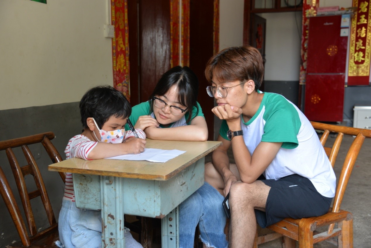 图为实践队队员在教蔓蔓画画。蔓蔓的一笔一画呈现的都是她心中最美的形象。