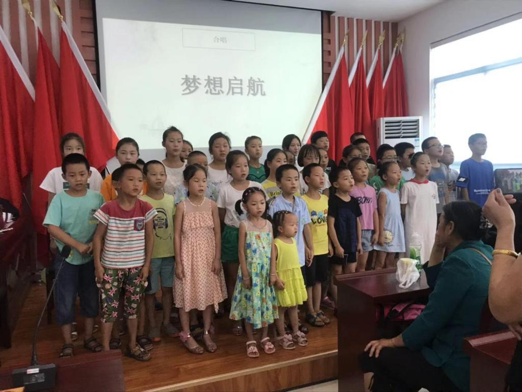 8月13日,江陵县普济镇杨岔路村“希望家园”结业仪式,志愿者陈雅文竹笛伴唱,孩子们齐唱《虫儿飞》《送别》