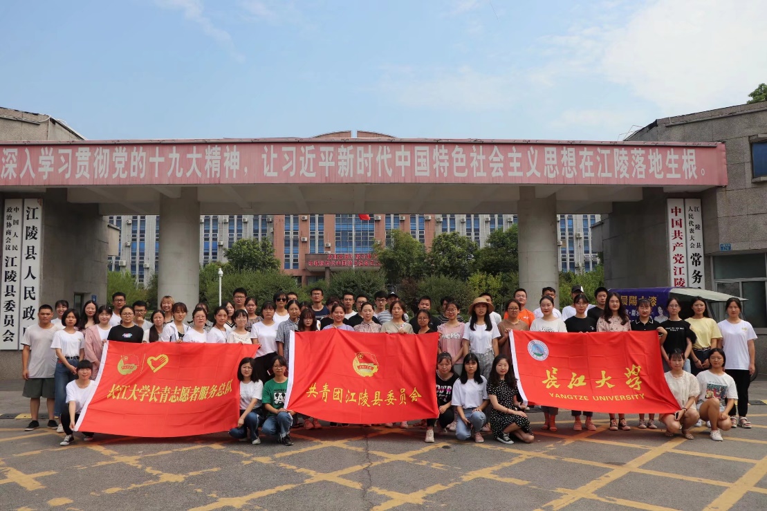 8月15日,爱在晨曦-乡村关爱实践团57名志愿者在江陵县人民政府前合影留念