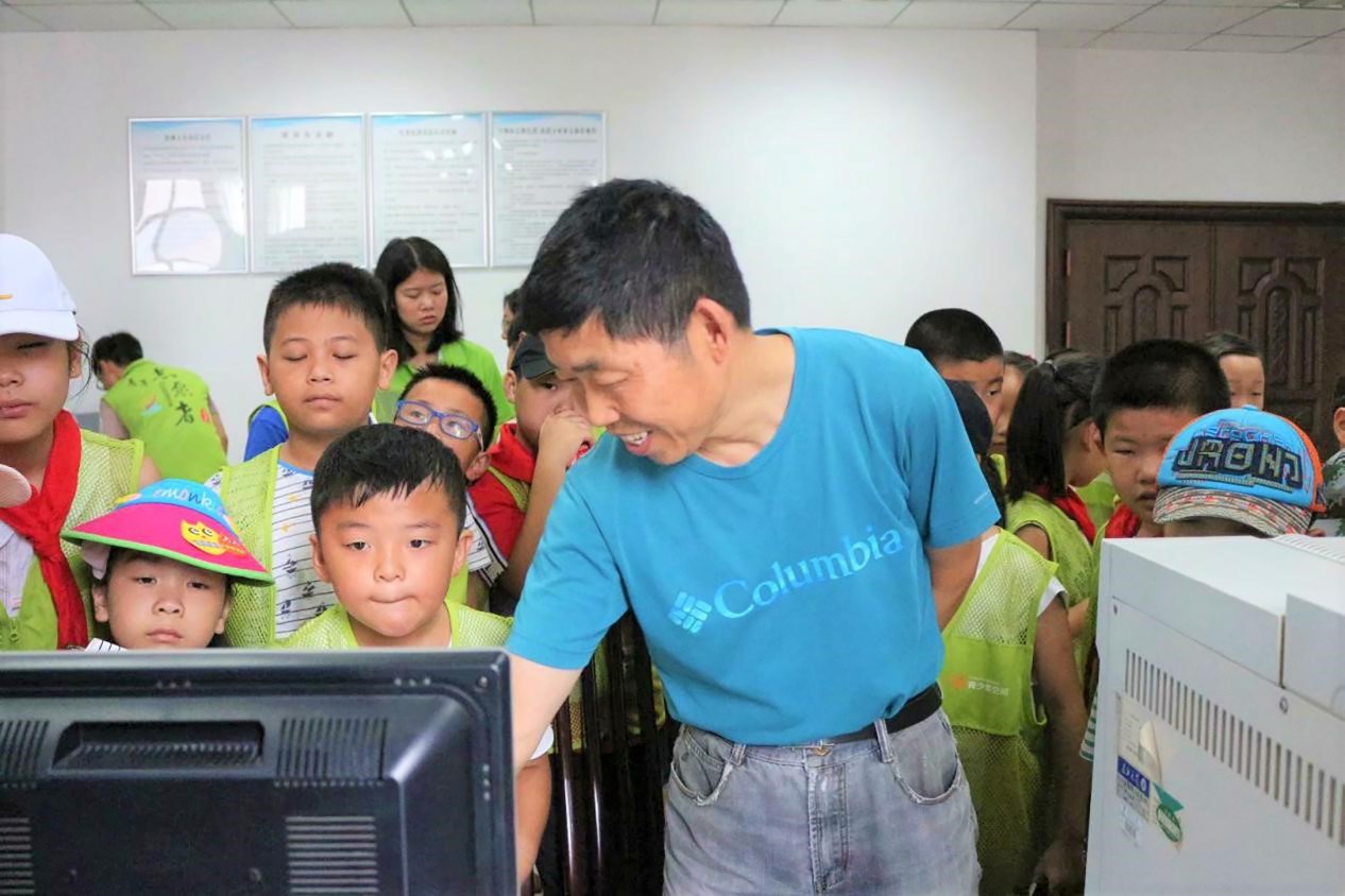 图为常青队队员带领小学生参观学校实验室,并由老师为小学生介绍各种仪器