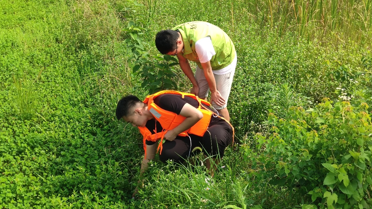 图为常青队队员深入农田,在农田灌溉水渠采集水体样本