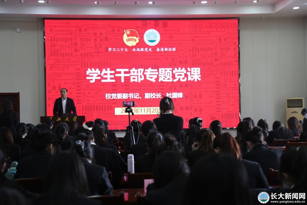 新闻网讯(通讯员 王木子 周悦 邹静雯 陈兴旺 董思怡)为深入学习宣传贯彻党的二十大精神,进一步加强学生干部队伍建设,提升学生干部综合素质,11月20日上午10时,党委副书记、副校长杜国锋围绕“弘扬伟大建党精神 做新时代好青年”为学生干部讲授专题党课。