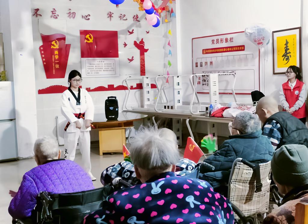志愿服务在异彩纷呈的文艺演出中正式拉开序幕,合唱、手势舞、跆拳道等一系列节目给平日里清净的老人公寓带来阵阵欢声笑语,现场呈现出一派温馨的氛围。