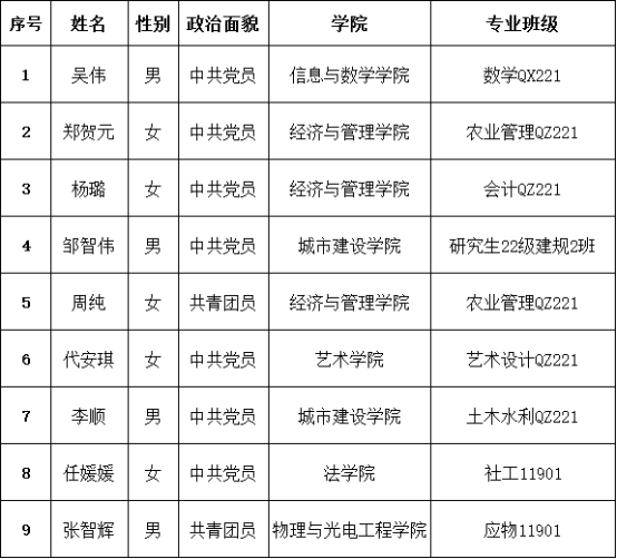 经个人报名、资格审查、笔试、面试答辩考核等环节,现将拟任校团委兼职团干人选情况予以公示。