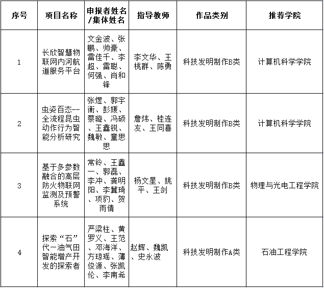 根据《关于组织开展第十八届“挑战杯”全国大学生课外学术科技作品竞赛的通知》 《关于组织开展湖北省第十四届“挑战杯·中国银行”大学生课外学术科技作品竞赛的通知》要求,拟推荐《长欣智慧物联网内河航道服务平台》等4件作品参加第十八届“挑战杯”全国大学生课外学术科技作品竞赛,作品信息如下。