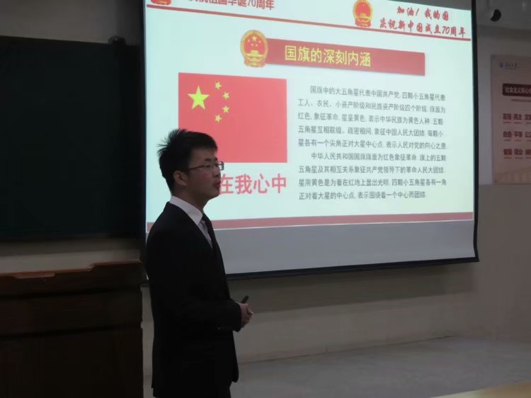 学习过程中,沈马锐带领同学们观看了“新中国史诗70年”的辉煌成就的视频,一起学习了“国庆节”的由来、新中国成立的意义及国旗的内涵;他分别从爱国主义的内涵、基本要求、优良传统以及爱国人士的优秀事迹等方面进行了讲解,号召同学们树立爱国主义思想,为实现中华民族的伟大复兴而奋斗。