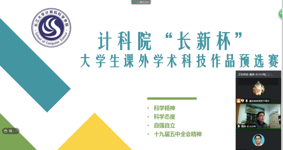 (通讯员 周可心 张茜)3月5日19:30,计算机科学学院在腾讯会议上举行了“长新杯”大学生课外学术科技作品竞赛院级预选赛。经过层层选拔,学院共4支参赛队伍进入最终环节,参与此次答辩。本次比赛由学院副院长詹炜主持,特邀白凯、靳国兴、雷鸣三名老师参加。