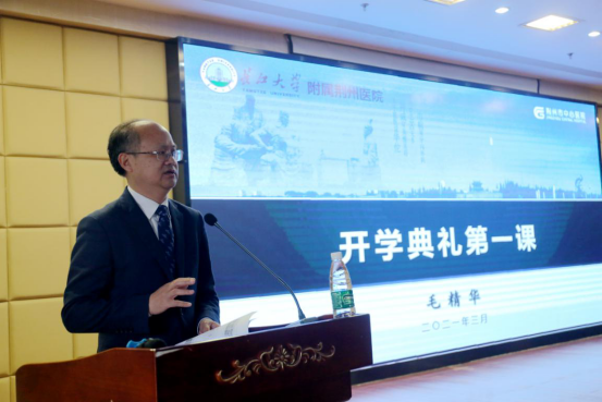 开学典礼现场,毛精华为学生们上了开学典礼第一课,他从历史、文化、发展、学科以及抗疫工作等方面介绍了医院的基本概况,并就医院教学十四五规划进行了解读。他指出,临床学习是由学校走向社会的第一步,是培养和提升个人逻辑思维能力的重要阶段,也是巩固专业思想,提升专业本领的黄金时期。希望同学们牢记学医初心,以梦为马、不负韶华,早日成长为一名合格的医者。