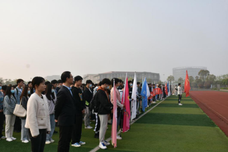 最后由许战向魏红洁授旗并合影留念。授旗结束后,全院师生按照队伍由左至右依次围绕跑道跑两圈。