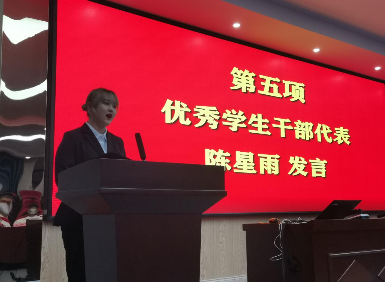 油卓22001班班长、新媒体工作室干事陈星雨同学作为优秀学生干部代表发言,陈星雨发言道:“学干,学干,有两重意思,第一是学生然后才是干部,第二是要先学习然后再干事”,她号召广大学生干部要努力学习,苦练本领,服务师生,做一名有能力、有责任、有担当的青年学生干部。