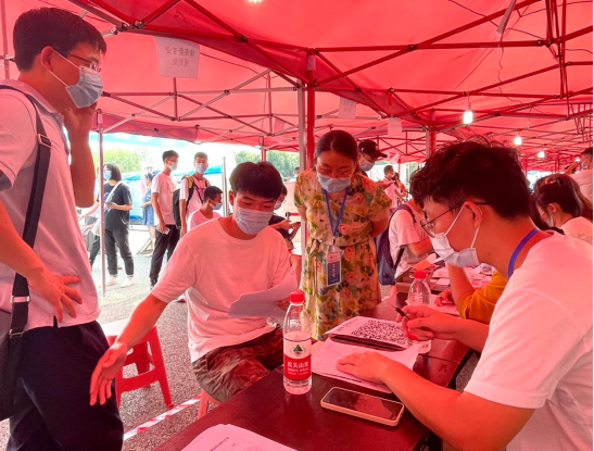 “同学你好,请出示健康码、行程码还有核酸证明。”“叔叔阿姨您好,因为疫情防控管理学校特地设有休息点,我们到那里等他们吧。”学生会成员及入党积极分子志愿者们恪尽职守,以饱满的精神状态迎接新同学的到来。