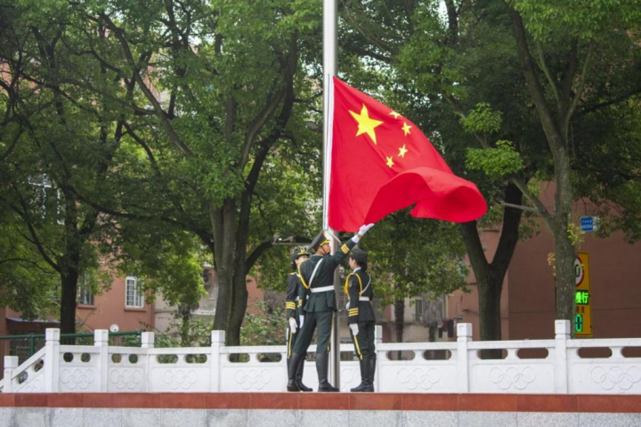 仪式开始,所有人员共唱红歌《共筑中国梦》后,升旗仪式正式开始 。国旗护卫队的队员们迈着整齐的步伐,护送国旗入场。伴随着庄严的国歌,五星红旗冉冉升起,全体师生怀着自豪和崇敬的心情,凝视着飘扬的国旗。