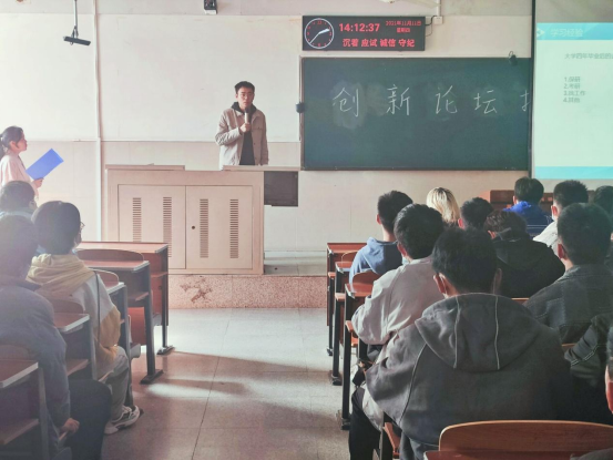 (通讯员 夏子阳、杨雨欣/文 汪林畅、李月梅/摄)11月11日下午2时许,电子信息学院创新论坛讲座顺利进行。本次讲座由辅导员讲话、2018级优秀学生代表讲话、自由提问、学委代表讲话四部分组成。