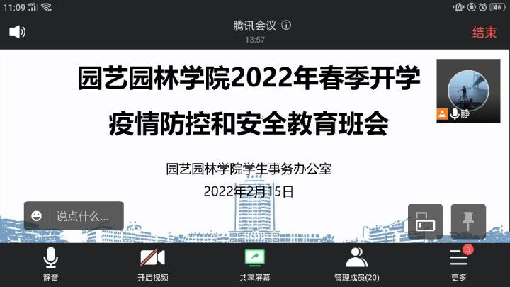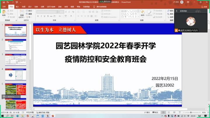 根据《关于做好2022年春季学期开学准备工作的通知》,为有效降低疫情传播风险,确保春季学期开学工作平稳有序,园艺园林学院于2022年2月15日-2月16日针对全体学生以班级为单位召开了2022年春季开学疫情防控和安全教育主题班会,使学生了解返校流程及报到要求,做好疫情防控和安全教育。