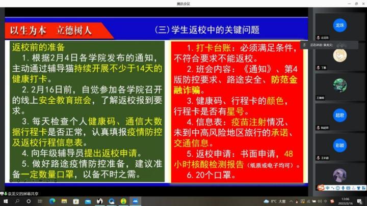 会议中,老师们嘱咐学生返校途中做好疫情防控准备,例如一定数量口罩和消毒液,以备不时之需,同时提醒学生注意路途安全,谨慎防范金融诈骗,有任何问题和困难及时报告各年级辅导员,学院将及时为学生排忧解难,为学生开学返校做好服务工作。