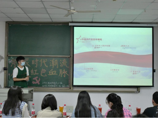 首先,在主持人杜子萱清脆响亮的声音宣布下,“青岚”一组的同学按顺序依次上台进行答辩。随着PPT一页一页地放映,一幕幕感人至深的场景被同学们用绘声绘色的语言演绎出来,一个又一个党史小故事被讲述,一项又一项实践的过程被分享。每位同学讲述中突出的关键词都有所不同,他们任选“理想创引、核心创立、宗旨创设、理论创新、制度创建、精神创铸、改革创举、复兴创业、统战创同、天下创和、军队创强、党建创先”中的两至三个进行研学,讲解的内容深刻丰富,在场的同学听得津津有味。