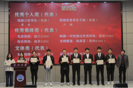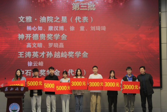 副院长李忠慧教授为“文雅”油院之星获奖者、神开德贵奖学金获得者、王涛英才奖学金、孙越崎奖学金获得者、中石油奖学金获得者代表颁奖。