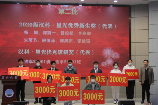“汉科星光”奖学金捐赠方湖北汉科新技术股份有限公司总经理、产学教授向兴国先生为汉科星光优秀新生奖、汉科星光班级奖获得者颁奖。“汉科·星光”奖学金由湖北汉科新技术有限公司为我院捐助设立,为我院资助育人、文化育人工作提供了强有力的帮助。