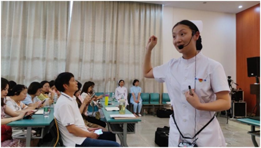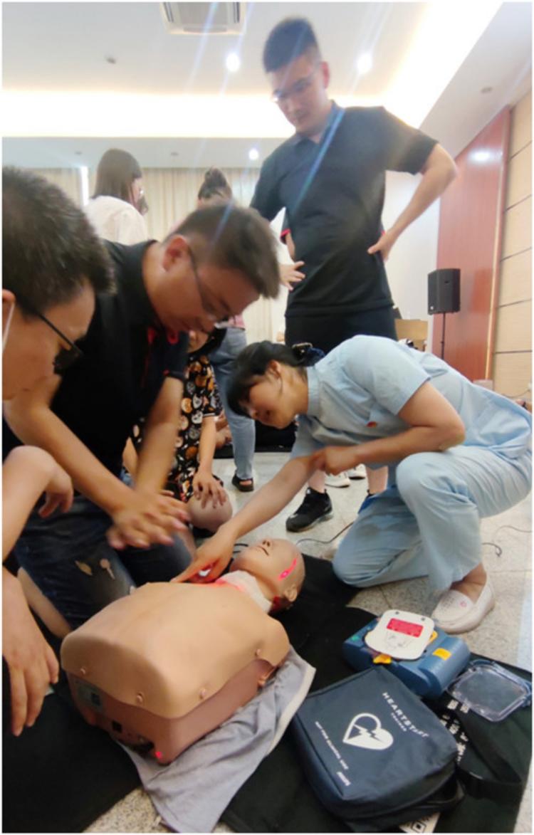在知识技能讲解示范阶段,医学部护理系教师邓文芳借助模拟人对心脏骤停的判断、心肺复苏的操作步骤及要点、注意事项等进项了详细讲解和示范,强调了尽早除颤对挽救心脏骤停病人的重要性并介绍了自动体外除颤仪搜寻和操作方法。在技能实训阶段,学员们分7组在模拟人身上练习心肺复苏术和自动体外除颤术,龚爱萍、守丹和邓文芳老师全程进行了指导。