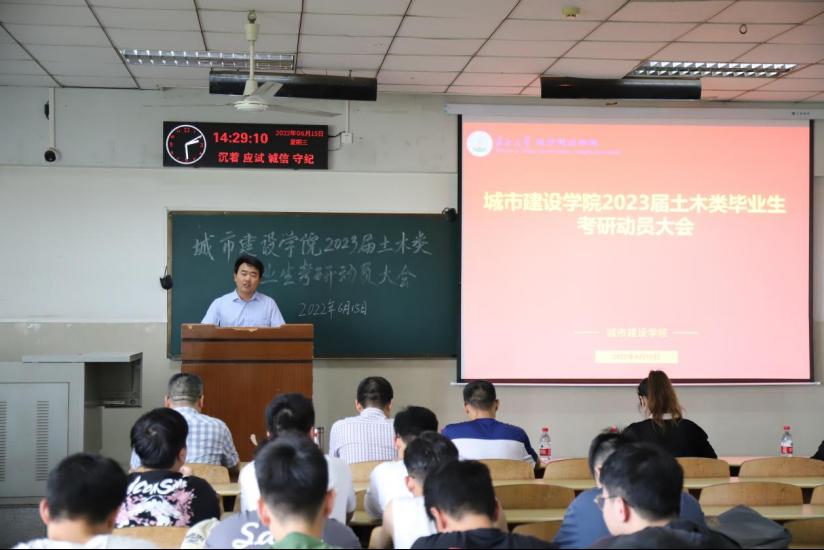 (通讯员 李嘉伟)人生万事须自为,跬步江山即寥廓。6月15日下午,城市建设学院在12教202室举办2023届土木类毕业生考研动员大会,支持和引导学生继续考研深造、学成报国。学院副院长张继承、院党委副书记秦良斌,学工办主任周喆、专业教师代表黄德文,以及全体19级土木类全体学生参加会议。会议由院团委副书记何儒权主持。
