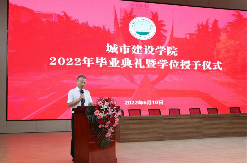 (通讯员 刘洋 周正)逐浪新时代,一起向未来。6月10日下午,城市建设学院在东校区四食堂3楼大厅举行2022年毕业典礼暨学位授予仪式。院长曾磊,副院长张继承、肖桃李、叶长才,以及导师代表、毕业班班主任代表、全体辅导员和2022届在校毕业生参加活动。活动由院党委副书记秦良斌主持。