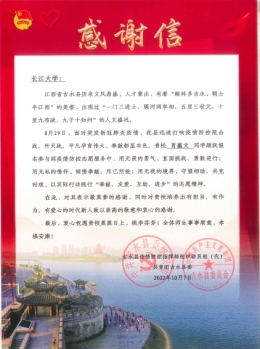 (通讯员:孟宪锦弘)近日,经济与管理学院团委书记杨雪老师收到了一封感谢信。信中,中共江西省吉水县委组织部、共青团吉水县委对我校经管学院经济12001班肖蕴文同学,在8月29日以来担任抗疫志愿者的优异工作表现给予了充分的肯定与赞扬,并对我学院培养出勇于担当、不怕困难的学子表示诚挚感谢。