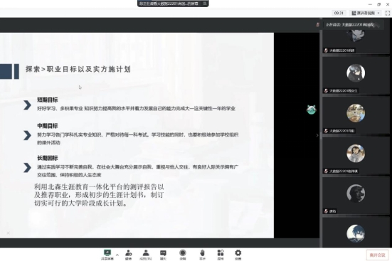 其次,各班陆续开展“职业生涯规划”主题班会,班会由各班班长组织实施,并邀请到班主任老师为同学们讲解专业前景和答疑解惑。引导同学们结合“北森生涯教育一体化平台”下的“职业兴趣”测试报告进行自我分析,从“知己”“知彼”“探索”三个方面开展讨论,“知己”,即进行积极的自我探索,联想自己的职业生涯目的、职业兴趣进行分析;“知彼",即结合专业、多方面了解,获得真实确切的信息;“探索”,即通过分析个人的兴趣、特长等,来制定切实可行的大学阶段成长计划。班会过程中,学生们积极参与讨论,受益匪浅。