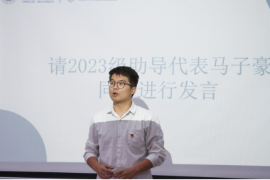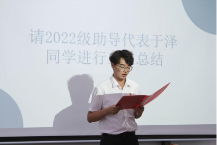 首先,由于泽同学代表2022级学生助导做工作总结。他对过去一年的工作内容、工作成绩作出回顾和总结,对班主任和辅导员老师给予的帮助和支持表示了由衷的感谢。他强调,责任心和包容心在助导工作中非常重要,助导是新生的引导者而不是管理者,要与新生建立真挚的关系,要用用言传身教的方法引导新生适应大学生活,用“我能够,我们能够”的态度共同进步,共同成长。