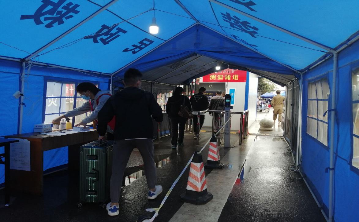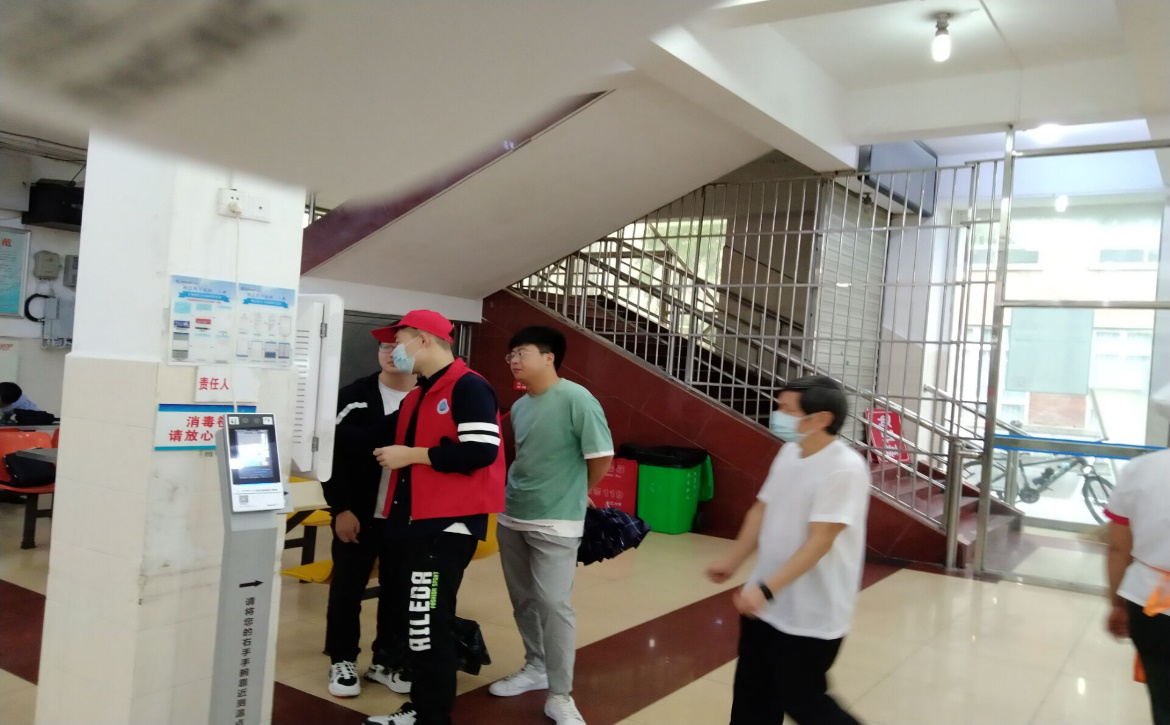 志愿者们在各路口值班,给新生以及家长们指路,舒缓交通的拥挤,并做好疫情常态下的测体温工作