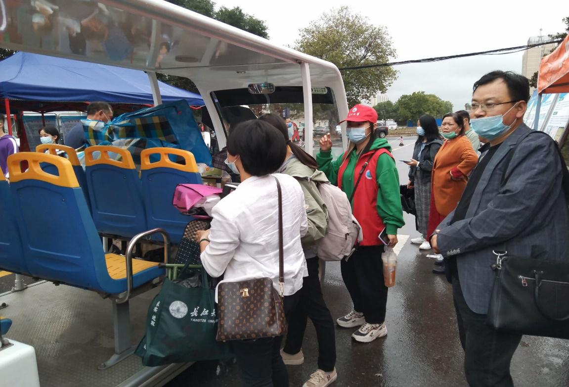 志愿者们给摆渡车司机指引路线,方便新生们直接到达自己宿舍,解决了途中可能遇到的很多问题
