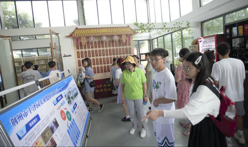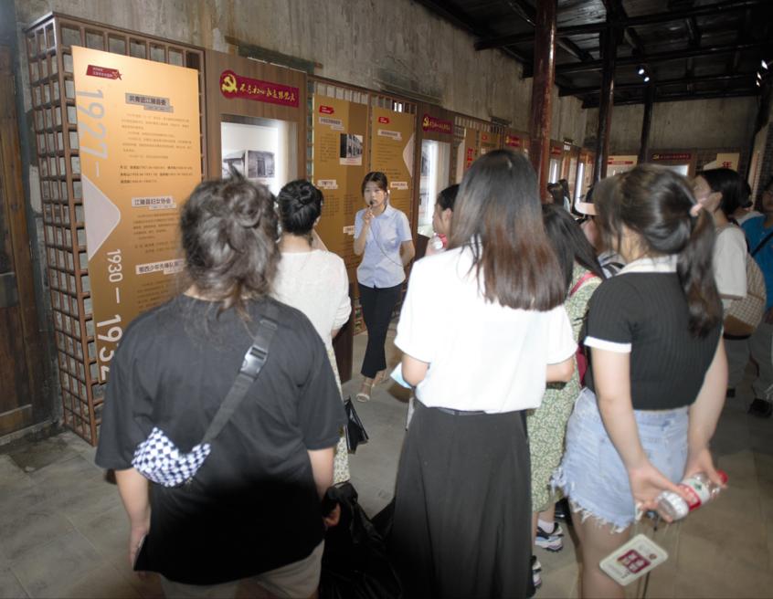 图为筑梦实践队队员参观洪湖瞿家湾湘鄂西革命根据地,从墙画中破除时空的藩篱,追溯红色血脉,学习革命精神。