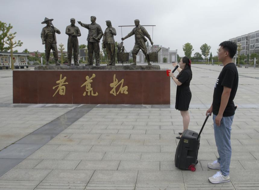 图为筑梦实践队的带队老师向队员们讲解荆州分洪纪念碑“拓荒者”背后的故事。